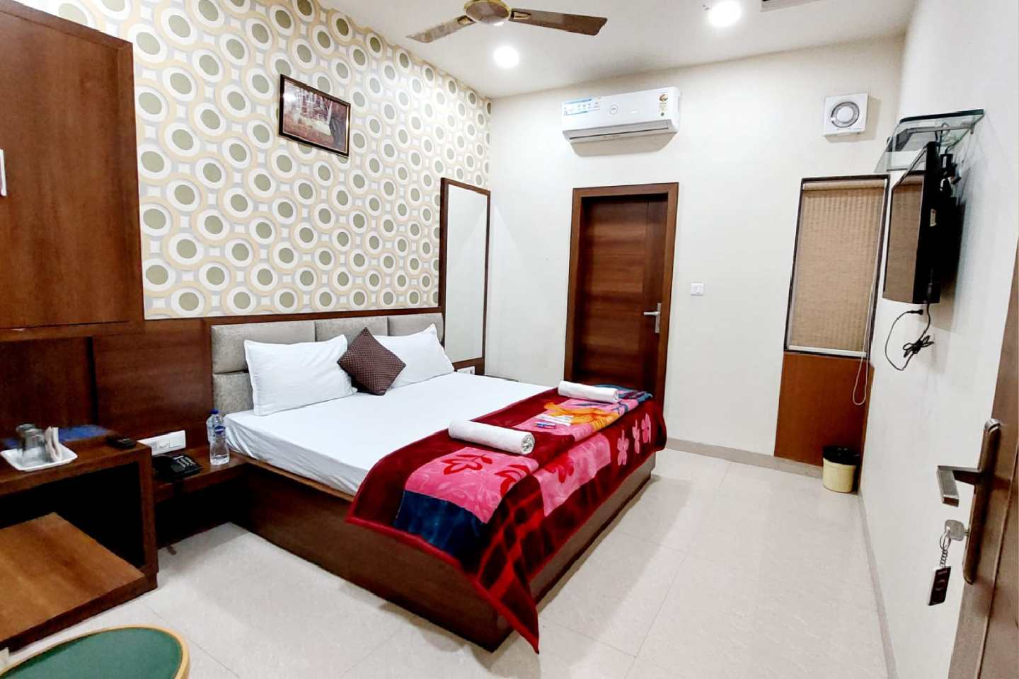Our Deluxe Room with a Double Bed is designed to offer both comfort and convenience for travelers visiting Mathura. Thoughtfully furnished, the room features a cozy double bed, clean and soothing interiors, and essential amenities to make your stay relaxing. With attentive housekeeping, private bathroom facilities, and in-room dining available from our pure vegetarian restaurant, you can experience homely comfort right in the heart of the holy city.